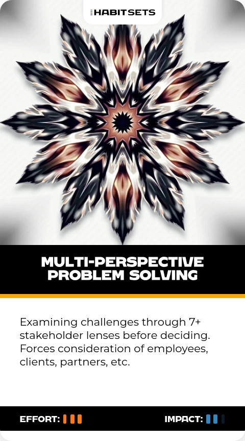 Examining challenges through 7+ stakeholder lenses before deciding. Forces consideration of employees, clients, partners, etc.
