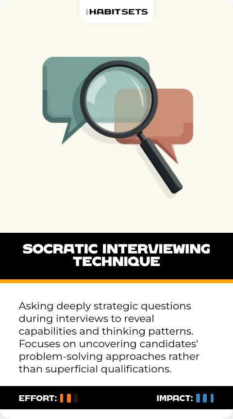 Asking deeply strategic questions during interviews to reveal capabilities and thinking patterns. Focuses on uncovering candidates' problem-solving approaches rather than superficial qualifications.