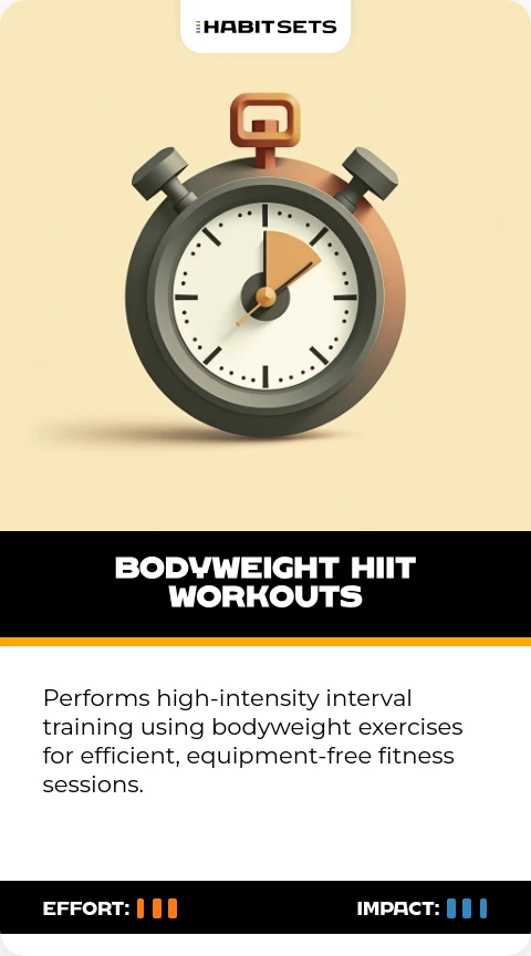 Performs high-intensity interval training using bodyweight exercises for efficient, equipment-free fitness sessions.
