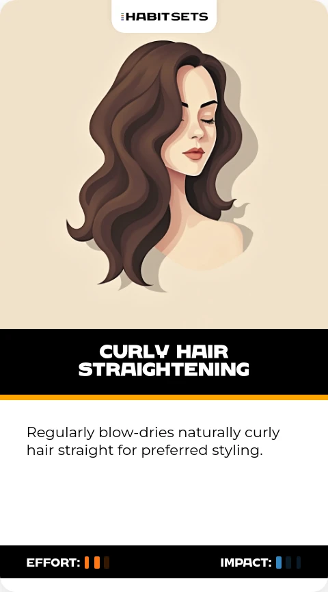 Regularly blow-dries naturally curly hair straight for preferred styling.