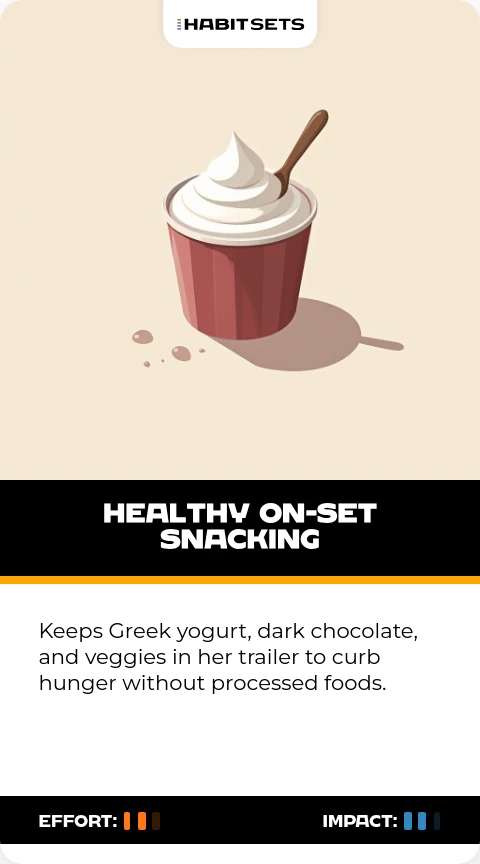 Keeps Greek yogurt, dark chocolate, and veggies in her trailer to curb hunger without processed foods.