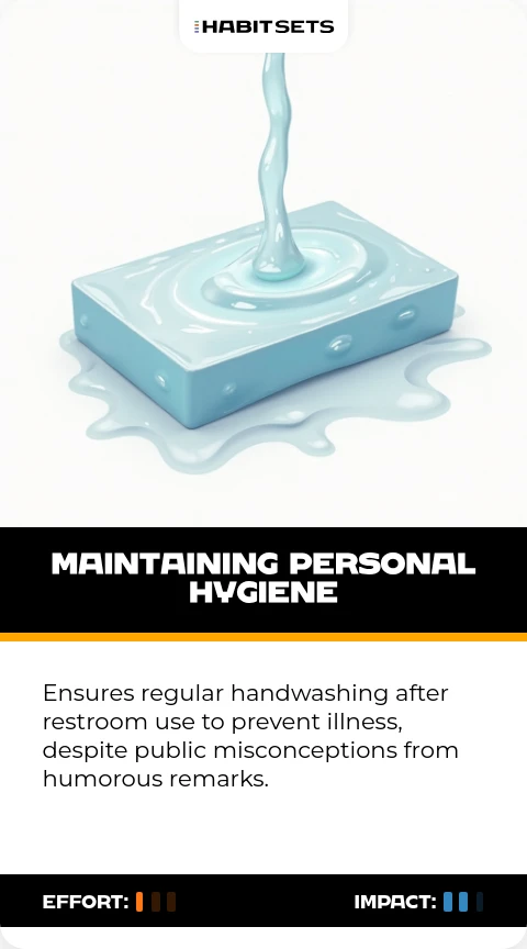 Ensures regular handwashing after restroom use to prevent illness, despite public misconceptions from humorous remarks.