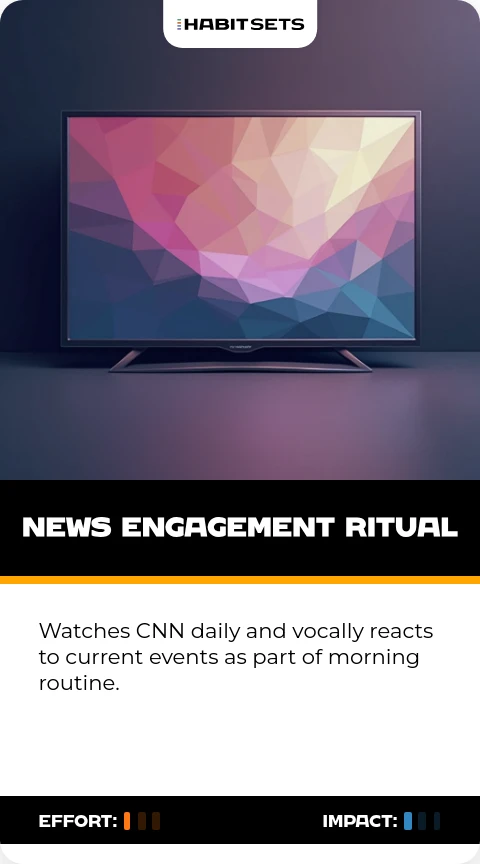Watches CNN daily and vocally reacts to current events as part of morning routine.