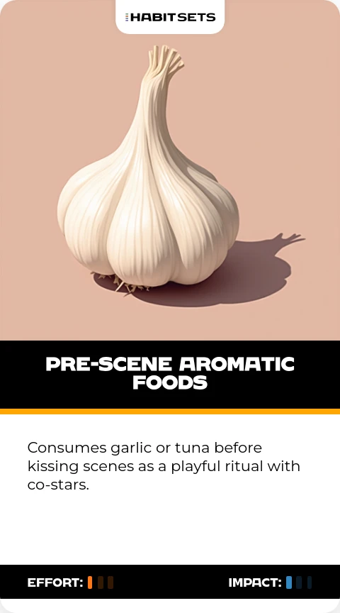 Consumes garlic or tuna before kissing scenes as a playful ritual with co-stars.