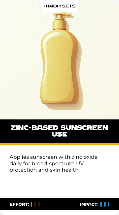 Applies sunscreen with zinc oxide daily for broad-spectrum UV protection and skin health.