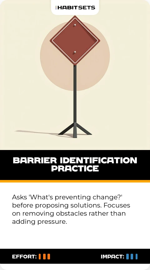Asks 'What's preventing change?' before proposing solutions. Focuses on removing obstacles rather than adding pressure.