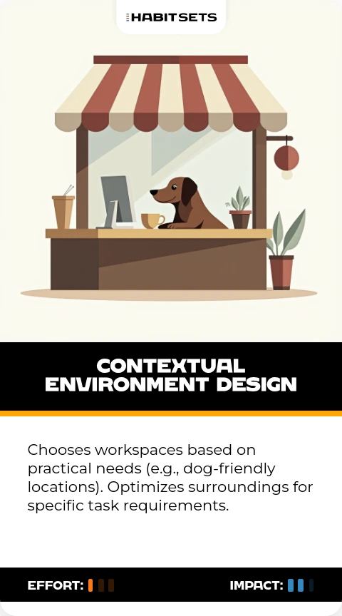 Chooses workspaces based on practical needs (e.g., dog-friendly locations). Optimizes surroundings for specific task requirements.