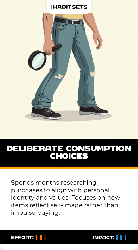 Spends months researching purchases to align with personal identity and values. Focuses on how items reflect self-image rather than impulse buying.
