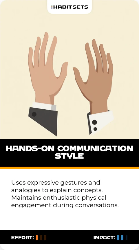 Uses expressive gestures and analogies to explain concepts. Maintains enthusiastic physical engagement during conversations.