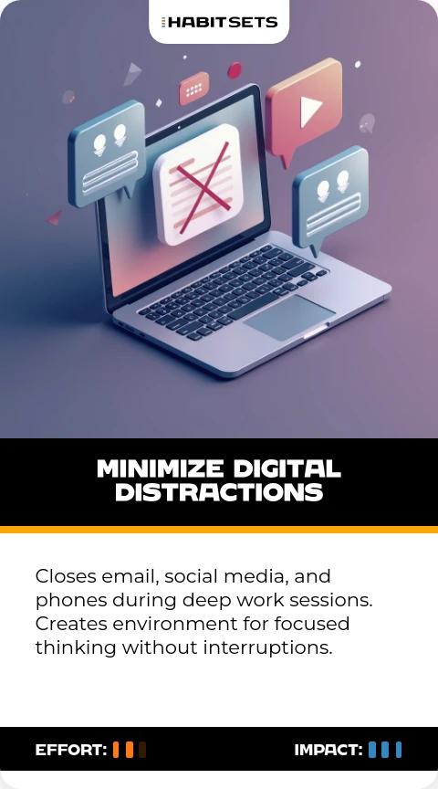 Closes email, social media, and phones during deep work sessions. Creates environment for focused thinking without interruptions.