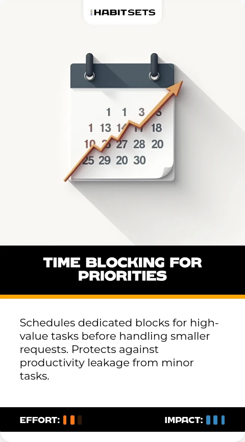 Schedules dedicated blocks for high-value tasks before handling smaller requests. Protects against productivity leakage from minor tasks.