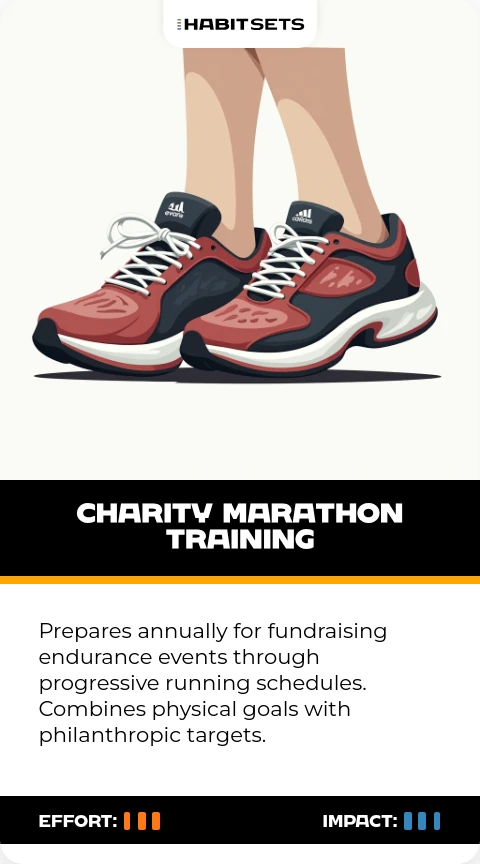 Prepares annually for fundraising endurance events through progressive running schedules. Combines physical goals with philanthropic targets.