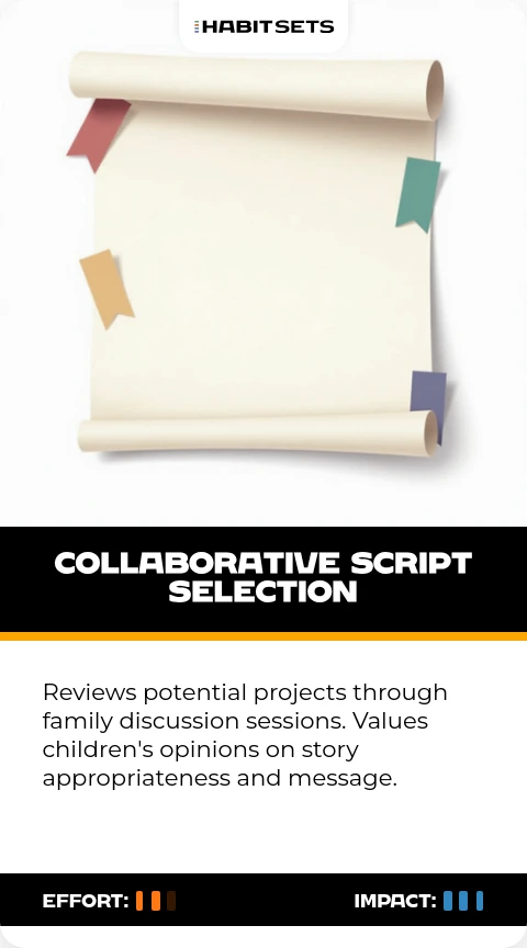 Reviews potential projects through family discussion sessions. Values children's opinions on story appropriateness and message.