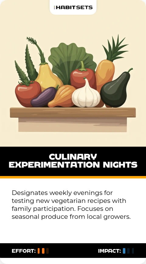 Designates weekly evenings for testing new vegetarian recipes with family participation. Focuses on seasonal produce from local growers.
