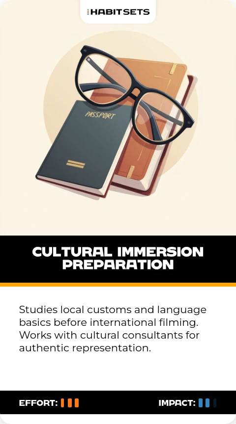 Studies local customs and language basics before international filming. Works with cultural consultants for authentic representation.