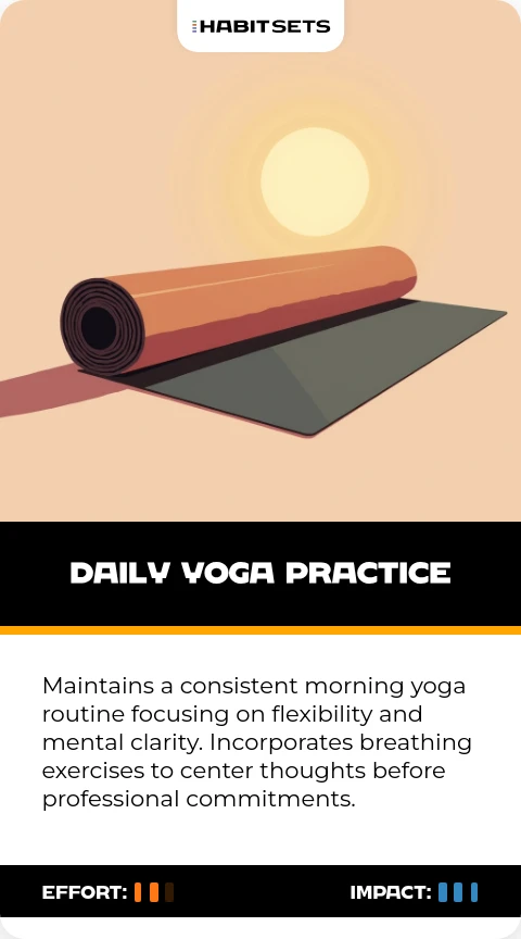 Maintains a consistent morning yoga routine focusing on flexibility and mental clarity. Incorporates breathing exercises to center thoughts before professional commitments.