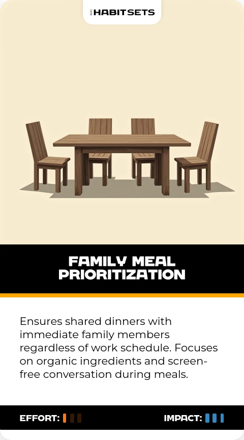 Ensures shared dinners with immediate family members regardless of work schedule. Focuses on organic ingredients and screen-free conversation during meals.