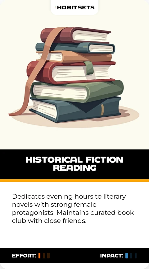 Dedicates evening hours to literary novels with strong female protagonists. Maintains curated book club with close friends.