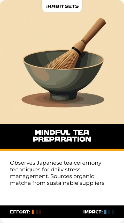 Observes Japanese tea ceremony techniques for daily stress management. Sources organic matcha from sustainable suppliers.