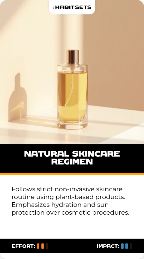 Follows strict non-invasive skincare routine using plant-based products. Emphasizes hydration and sun protection over cosmetic procedures.