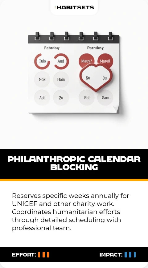 Reserves specific weeks annually for UNICEF and other charity work. Coordinates humanitarian efforts through detailed scheduling with professional team.