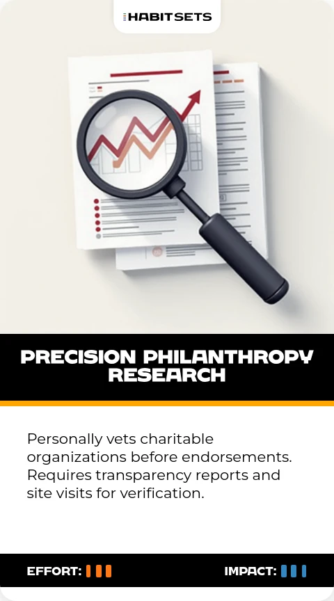 Personally vets charitable organizations before endorsements. Requires transparency reports and site visits for verification.