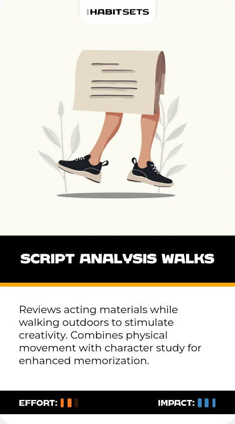 Reviews acting materials while walking outdoors to stimulate creativity. Combines physical movement with character study for enhanced memorization.