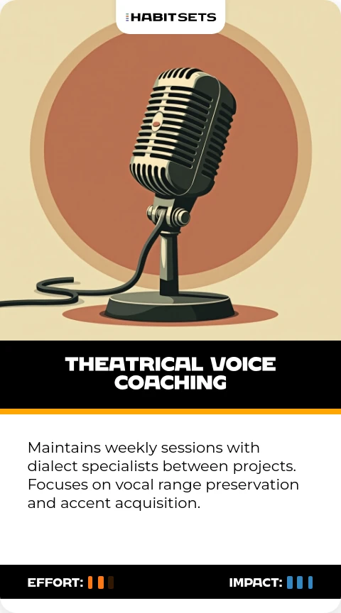 Maintains weekly sessions with dialect specialists between projects. Focuses on vocal range preservation and accent acquisition.
