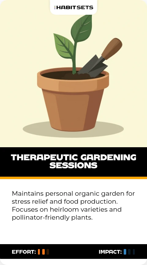 Maintains personal organic garden for stress relief and food production. Focuses on heirloom varieties and pollinator-friendly plants.