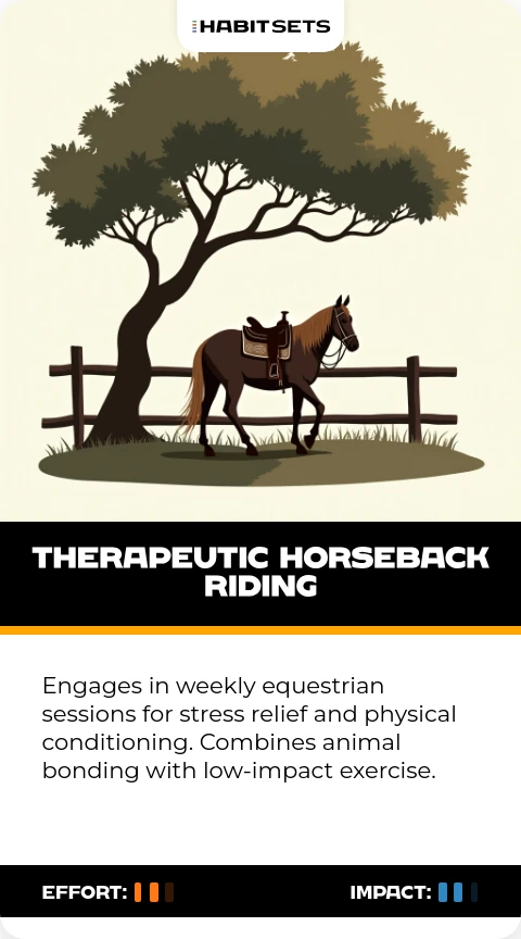 Engages in weekly equestrian sessions for stress relief and physical conditioning. Combines animal bonding with low-impact exercise.