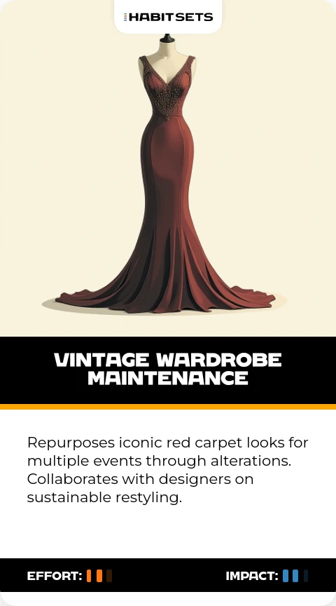 Repurposes iconic red carpet looks for multiple events through alterations. Collaborates with designers on sustainable restyling.