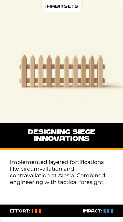 Implemented layered fortifications like circumvallation and contravallation at Alesia. Combined engineering with tactical foresight.