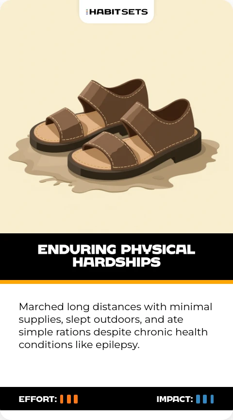 Marched long distances with minimal supplies, slept outdoors, and ate simple rations despite chronic health conditions like epilepsy.