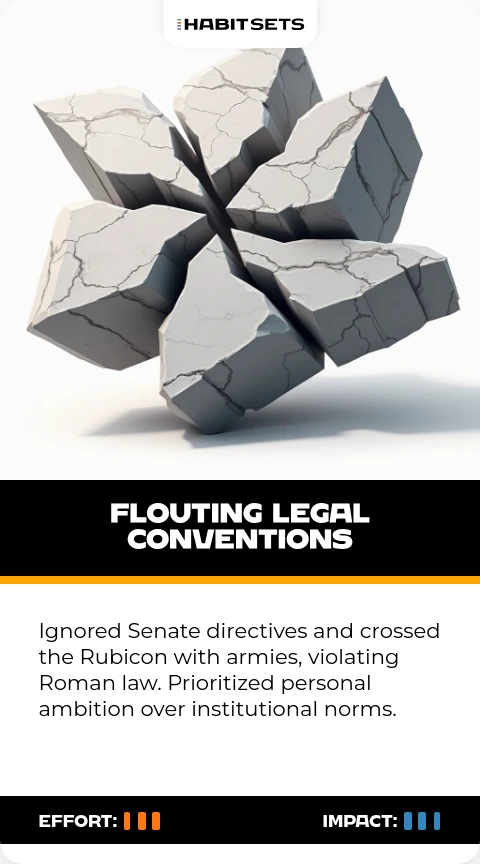 Ignored Senate directives and crossed the Rubicon with armies, violating Roman law. Prioritized personal ambition over institutional norms.