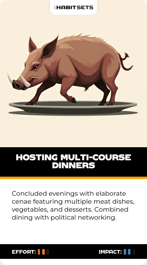 Concluded evenings with elaborate cenae featuring multiple meat dishes, vegetables, and desserts. Combined dining with political networking.