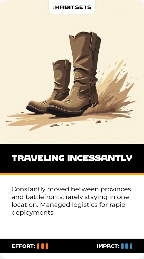 Constantly moved between provinces and battlefronts, rarely staying in one location. Managed logistics for rapid deployments.