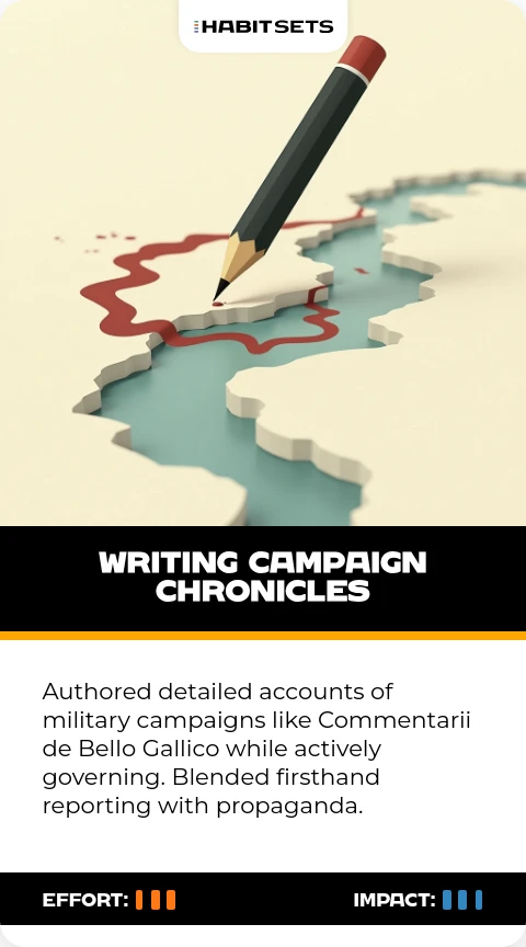 Authored detailed accounts of military campaigns like Commentarii de Bello Gallico while actively governing. Blended firsthand reporting with propaganda.