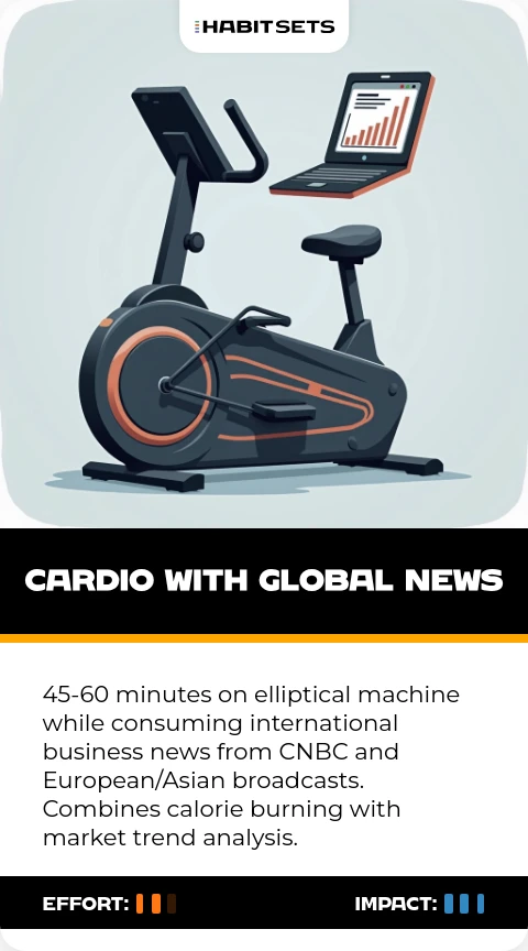 45-60 minutes on elliptical machine while consuming international business news from CNBC and European/Asian broadcasts. Combines calorie burning with market trend analysis.