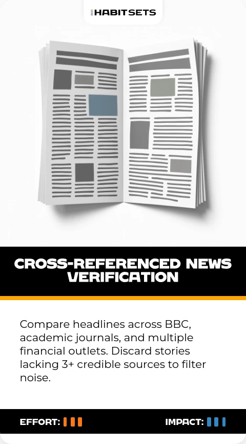 Compare headlines across BBC, academic journals, and multiple financial outlets. Discard stories lacking 3+ credible sources to filter noise.
