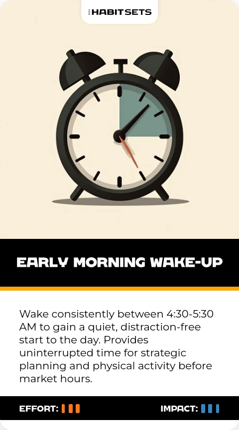 Wake consistently between 4:30-5:30 AM to gain a quiet, distraction-free start to the day. Provides uninterrupted time for strategic planning and physical activity before market hours.
