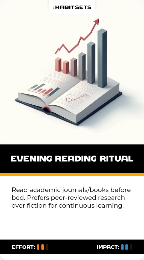 Read academic journals/books before bed. Prefers peer-reviewed research over fiction for continuous learning.