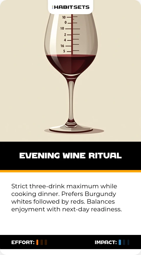 Strict three-drink maximum while cooking dinner. Prefers Burgundy whites followed by reds. Balances enjoyment with next-day readiness.