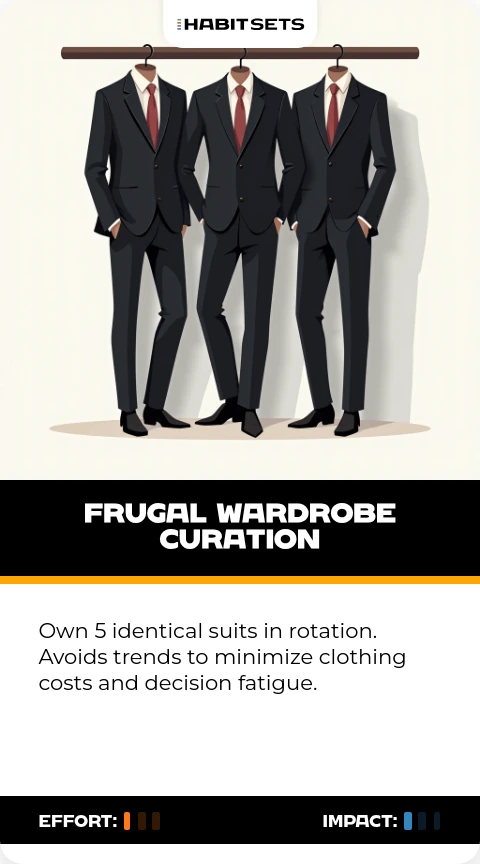 Own 5 identical suits in rotation. Avoids trends to minimize clothing costs and decision fatigue.