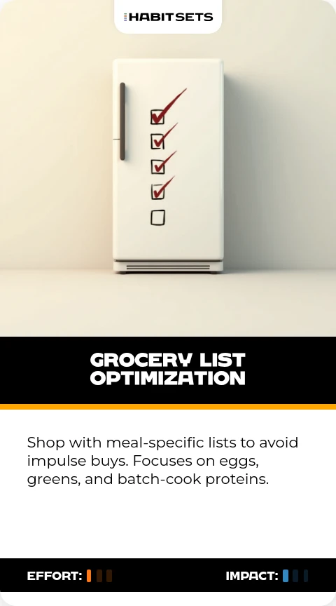 Shop with meal-specific lists to avoid impulse buys. Focuses on eggs, greens, and batch-cook proteins.
