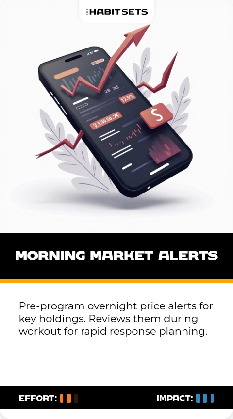 Pre-program overnight price alerts for key holdings. Reviews them during workout for rapid response planning.