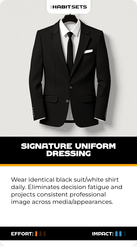 Wear identical black suit/white shirt daily. Eliminates decision fatigue and projects consistent professional image across media/appearances.