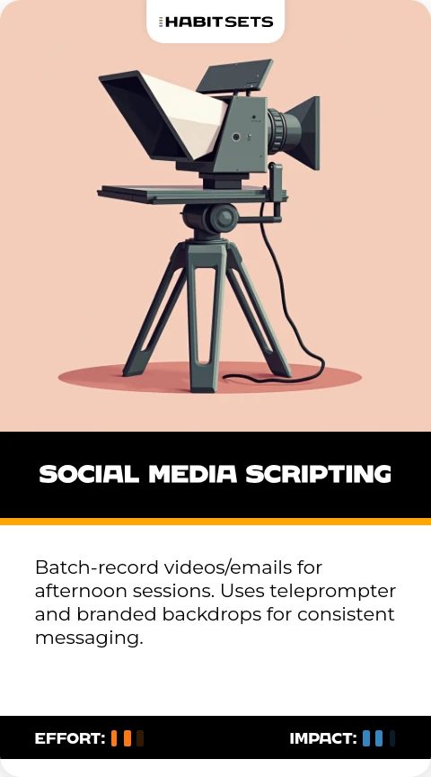 Batch-record videos/emails for afternoon sessions. Uses teleprompter and branded backdrops for consistent messaging.