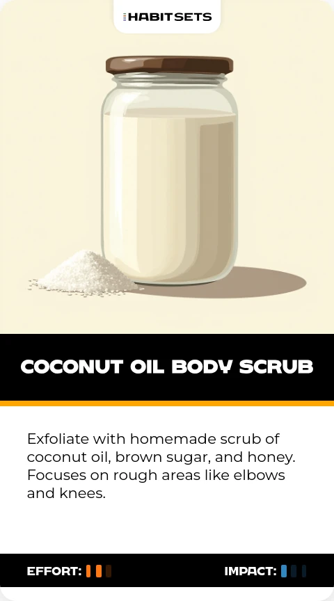Exfoliate with homemade scrub of coconut oil, brown sugar, and honey. Focuses on rough areas like elbows and knees.