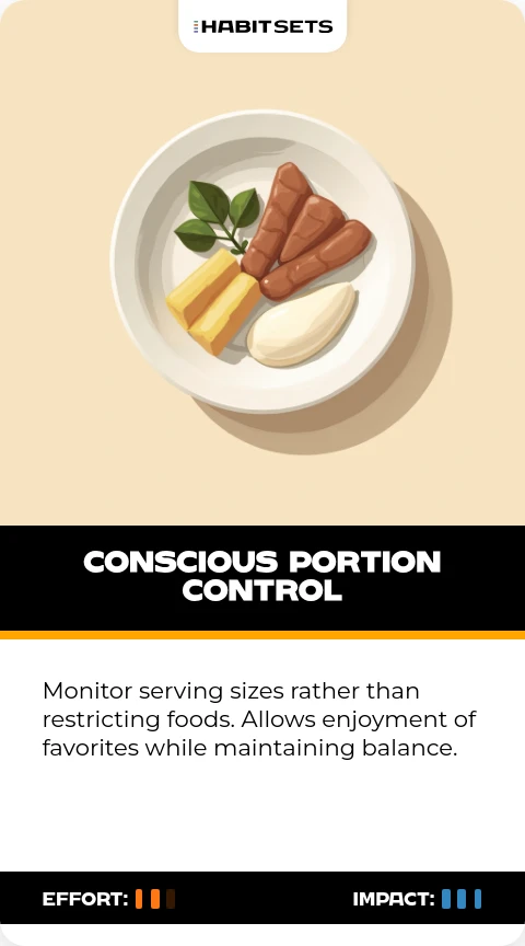 Monitor serving sizes rather than restricting foods. Allows enjoyment of favorites while maintaining balance.