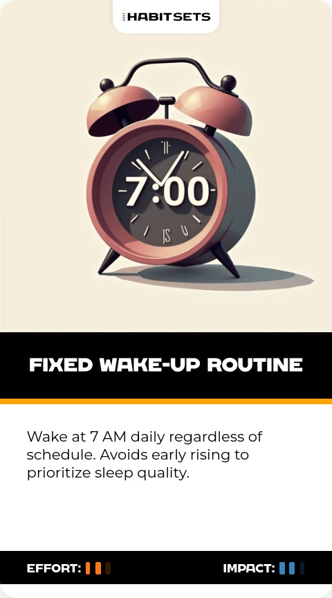 Wake at 7 AM daily regardless of schedule. Avoids early rising to prioritize sleep quality.